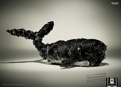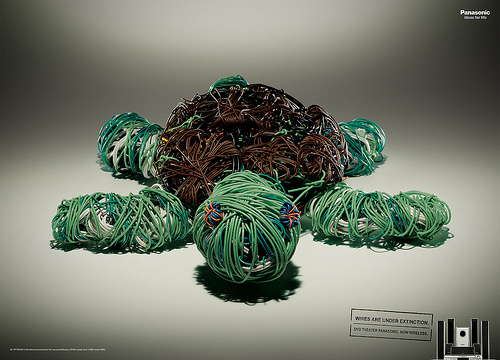 没错 这年头家用电器多了,线头多的一只怀疑自己和8只脚蜘蛛一样 所以广告上写着:电线已经没用了。还是很是能吸引人眼球的!
