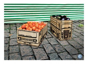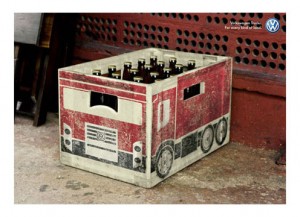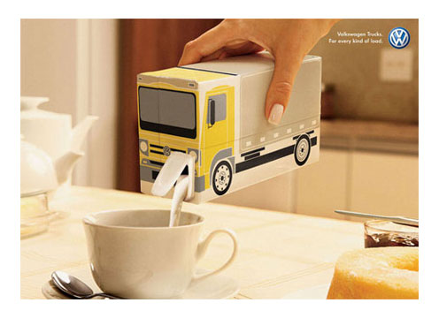 有想法,当有点牵强!还算过的去! 这个世界大众汽车的业务范围非常广泛,制造了很多生活当中必不可少的专用车辆 广告用各种物品的包装外观轻松表达这种概念,很容易理解。