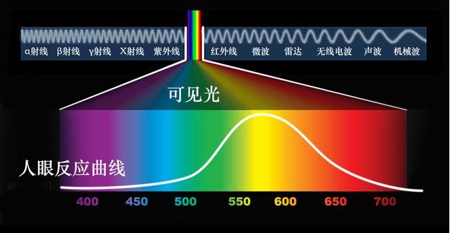 首先,我们来了解一下什么是光。光其实是电磁波中的很小一部分,一般意义上就是我们肉眼能看到的电磁波的波段(也称可见光),科学上定义在390nm – 780nm,但是人眼能看到的范围在312nm – 1050nm甚至更广。在这个范围内,人们依次能看到紫、蓝、青、绿、黄、红等颜色。这些颜色的分布是不均匀的,红、绿、蓝所占有的波段范围比较大;相反,黄、青、紫所占有的波段范围就比较小,但是黄色的所占有的波段范围又比青、紫略大。
