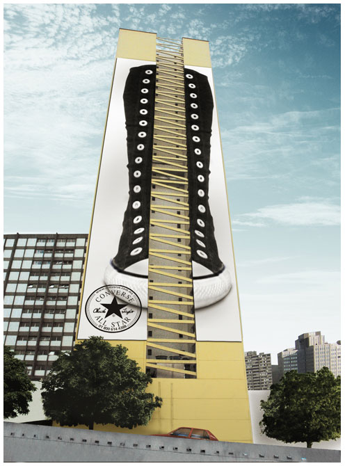 匡威的这个屋外广告有效地利用了大厦的中间部分, 这种线状结构在与匡威画面相结合之后很像鞋子的鞋带部分,呵呵…看起来挺不错。 好大,好鞋额(邪恶)!