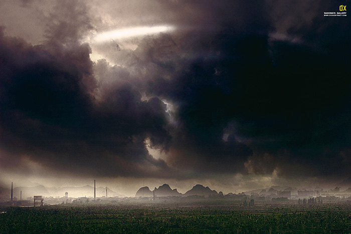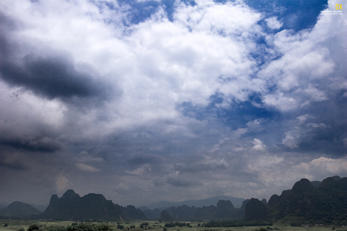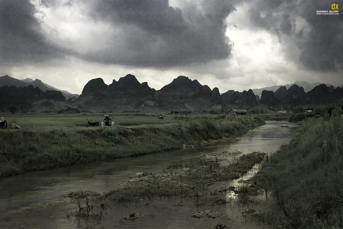 山村景色;田园、竹林、牧牛、农舍、炊烟,加上层次分明的峰林作背景,构成道道的风景。