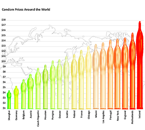 这个图标注了世界上各个地区和国家的杜蕾丝安全套价格,这里主要是指的Durex Elite 12个