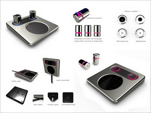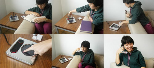 刚看到的时候,半天不知道是个什么玩意 Zinchan Design的这款电话带有分体式的听筒和话筒,它们平时是被固定在底座上的, 当需要接听电话时,则只需要将其插在拇指和小指上做出打电话的手势即可像传统的听筒一样使用。而电话主机上则配有一个独特的触摸屏,这款触摸屏可以记录你拨号轨迹, 并可以将轨迹与特定的人关联起来。这样一来你就可以通过轨迹来识别联系人了。 设计师们的这些新奇的构造创意想法让传统的电话这种相对传统的通信工具又重新焕发了生机。