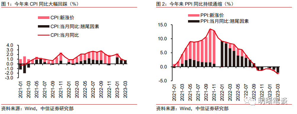 要命的数据来了, 2023年来CPI同比大幅回踩,PPI同比持续通缩。2023年1到3月,CPI同比从2.1%持续下行至0.7%,3月读数大致对标2020年9月和2022年1月的低位水准,其中食品项同比从6.2%回落至2.4%,非食品项同比从1.2%下行至0.3%,核心CP同比也从1%下行至0.7%,各分项环比均在2月转负。PPI同比自从2022年10月转负后持续通缩,去年12月短暂回升后再度探底,3月-2.5%的读数为2020年7月至今的新低,生产资料价格通缩是PPI同比持续负增的主导因素;环比层面在1月短暂下行后以持平为主。总体而言,当下CPI同比回踩、PPI同比通缩的格局与2020年四季度较为类似,而当年11月与次年1月CPI同比短暂转负引起了市场对于后续通缩的担忧!